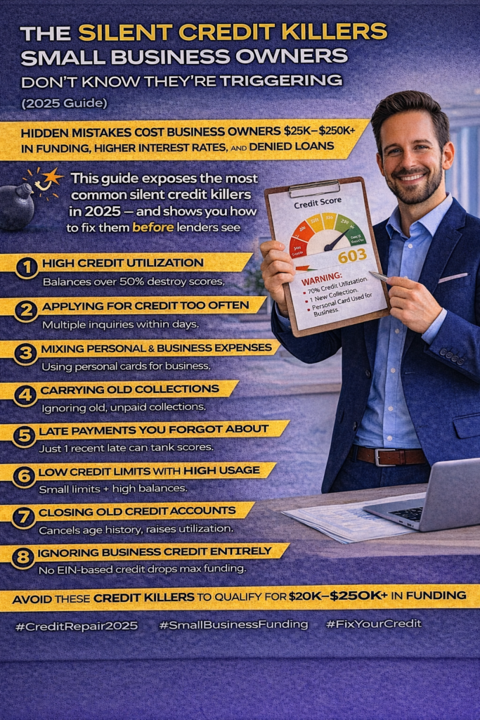 👉 These hidden credit killers can quietly cost you $25,000–$250,000+ in funding, higher interest rates, and missed business opportunities.