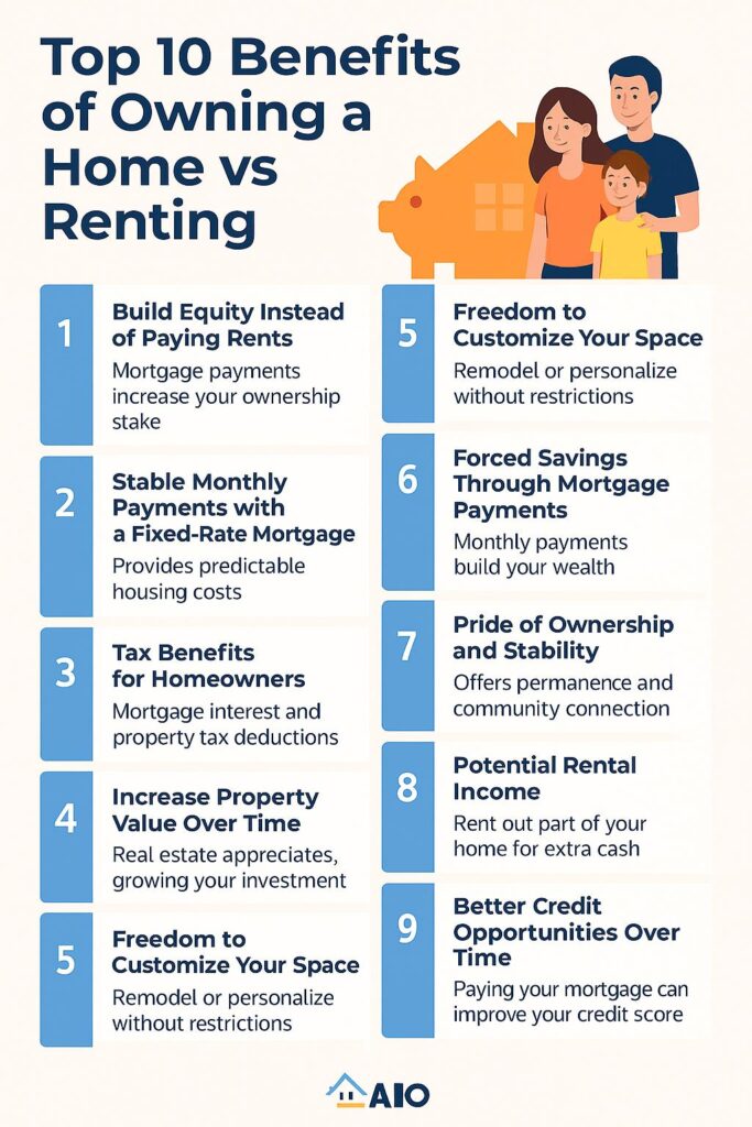 In today’s uncertain real estate market, many people ask, “Should I rent or buy a home?” While renting offers flexibility, owning a home comes with powerful long-term advantages that can significantly improve your financial future. This article explores the top 10 benefits of owning a home vs renting, helping you make an informed decision in 2025 and beyond.